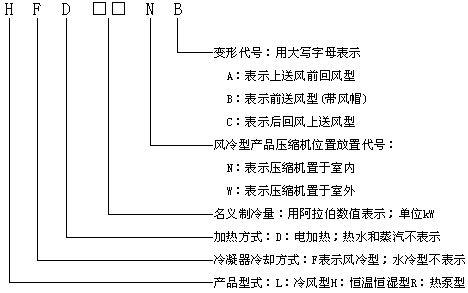 型號舉例:HF19N 表示名義制冷量為19kW的壓縮機(jī)置于室內(nèi)的風(fēng)冷型單元式空調(diào)機(jī)組。